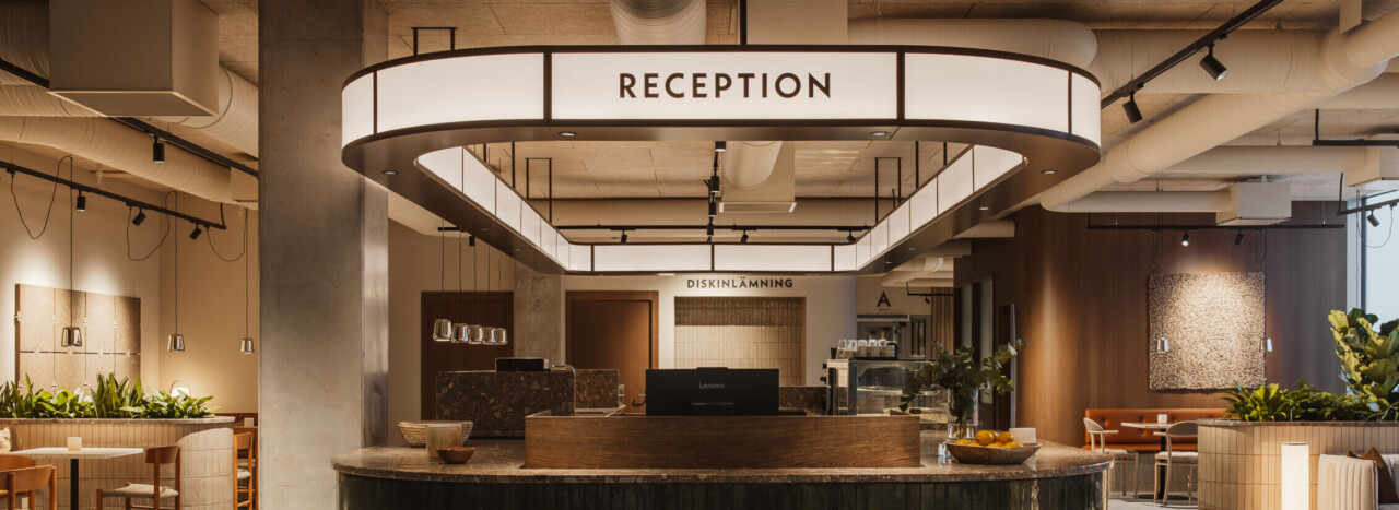 Med den centralt placerade receptionen som sömlöst smälter samman med cafédisken ville vi definiera den öppna ytan och skapa en central samlingspunkt. Disken är designad med runda former för att skapa ett inbjudande och tillgängligt intryck från alla håll. Mötet mellan människor är i fokus och med varierade sittningar som är både öppna och mer avskilda skapas goda möjligheter för arbete och spontana möten, men även en paus.