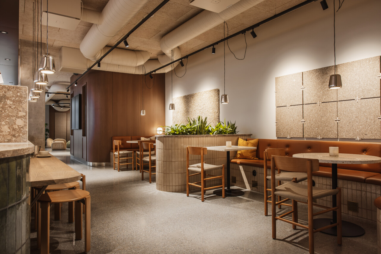 Caféets trivsamma miljö är utformad med specialritade platsbyggda soffor och rikligt med växter som skapar en behaglig avskildhet. Det stöttar även en naturlig variation av möblering och kulörer som ger en mer varm och hemlik karaktär. På så sätt kunde vi skapa en miljö som känns personlig och levande, snarare än standardiserad eller formell.