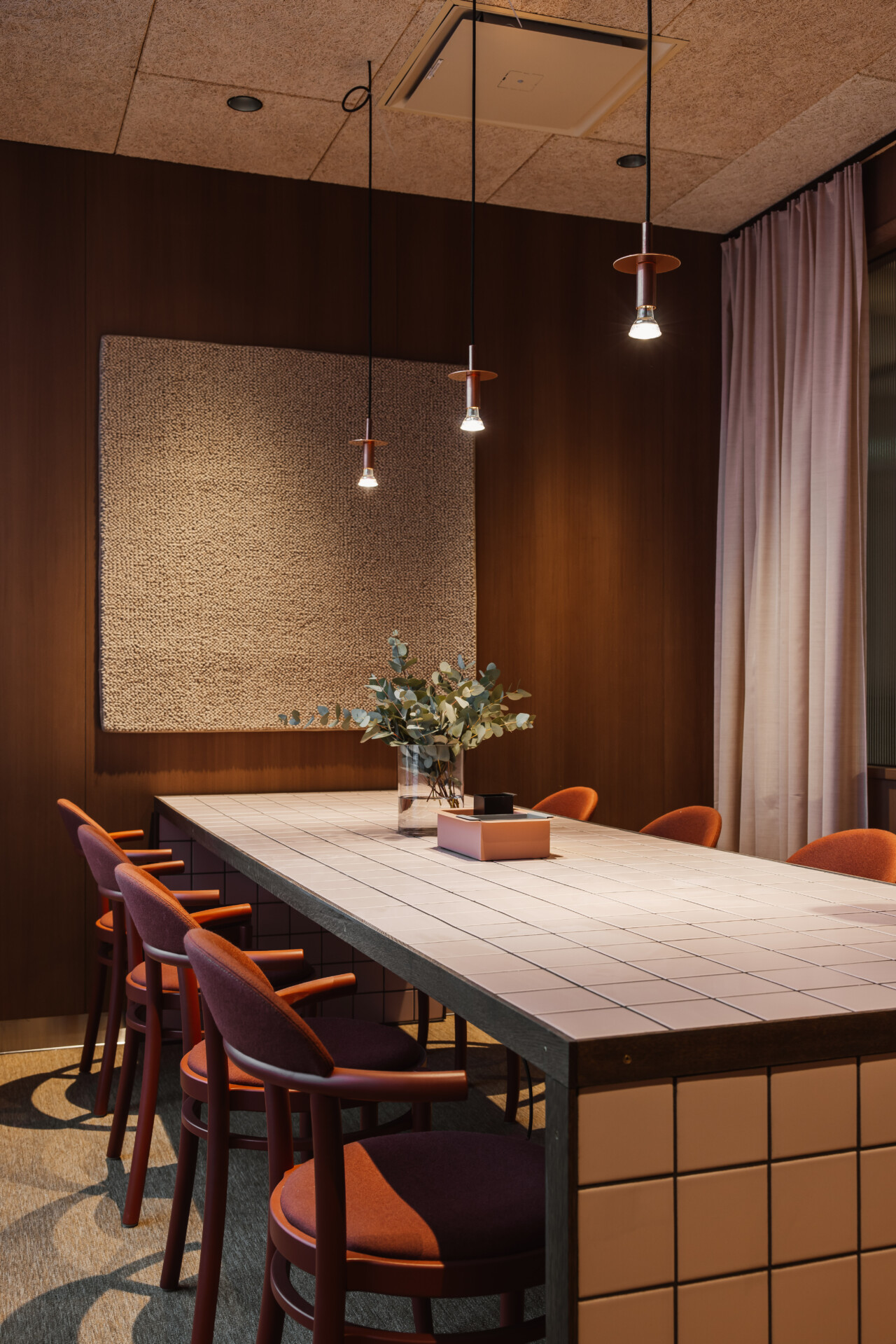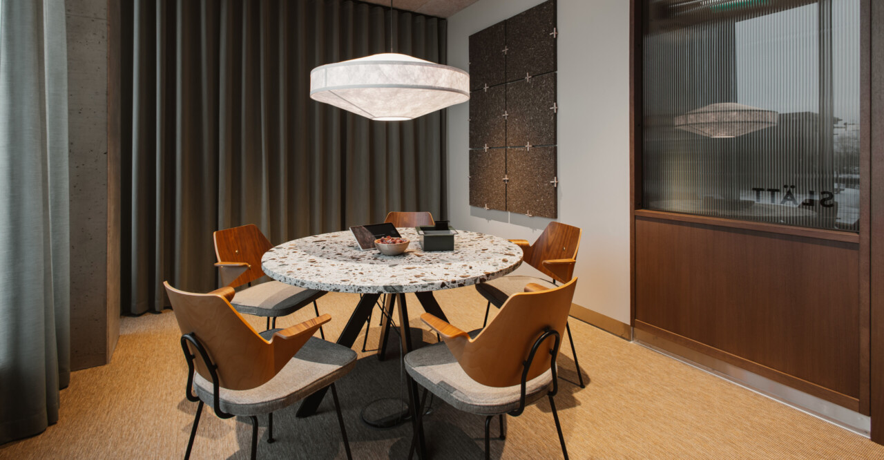 De enskilda mötesrummen ligger i entrérummets ytterkanter och är byggda som eleganta finsnickrade volymer i mörkoljad ek. Glaspartier i linjeglas ger avskildhet samtidigt som de släpper igenom ett mjukt dagsljus. Närheten till kaféet och de öppna ytorna gör det enkelt att växla mellan möten, gruppdiskussioner och pauser – något som bidrar till att entrérummet hålls levande och aktivt under hela dagen.