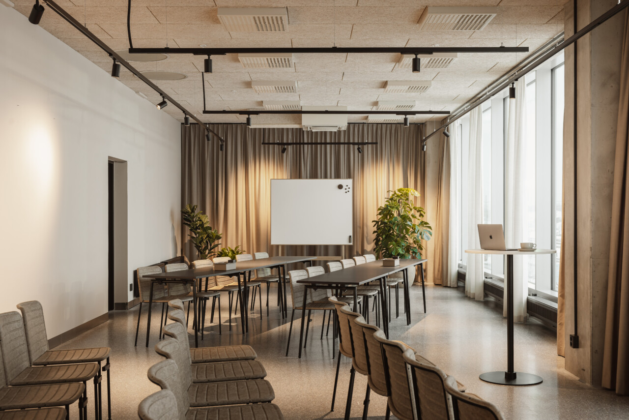 Det största mötesrummet är multifunktionellt och rymmer 50 personer som lätt kan möbleras om till andra evenemang. Härifrån har man också en fantastisk utsikt mot den skånska slätten, tågen och kontinenten.