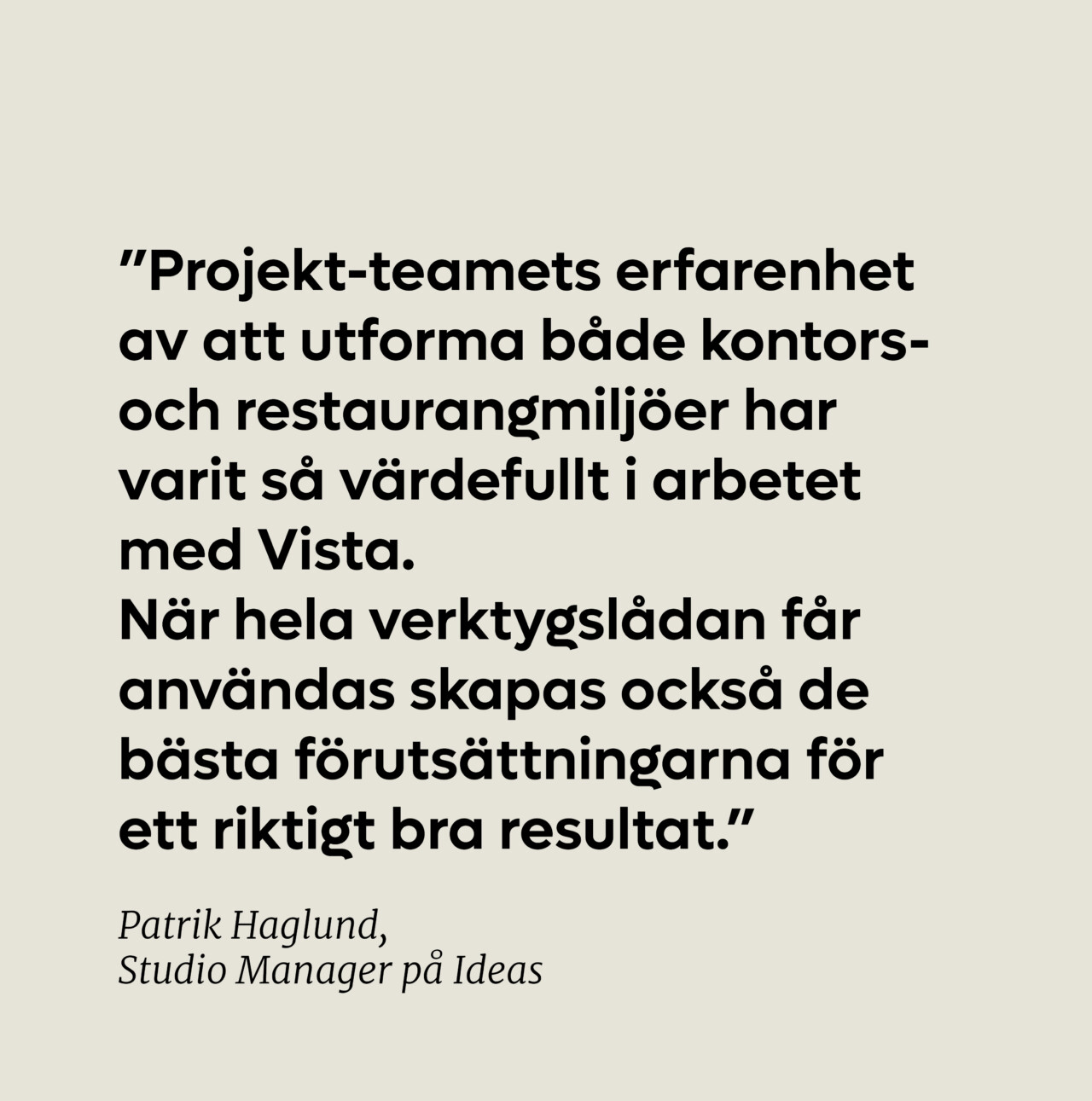 ”Projektteamets erfarenhet av att utforma både kontors- och restaurangmiljöer har varit så värdefullt i arbetet med Vista. När hela verktygslådan får användas skapas också de bästa förutsättningarna för ett riktigt bra resultat.”