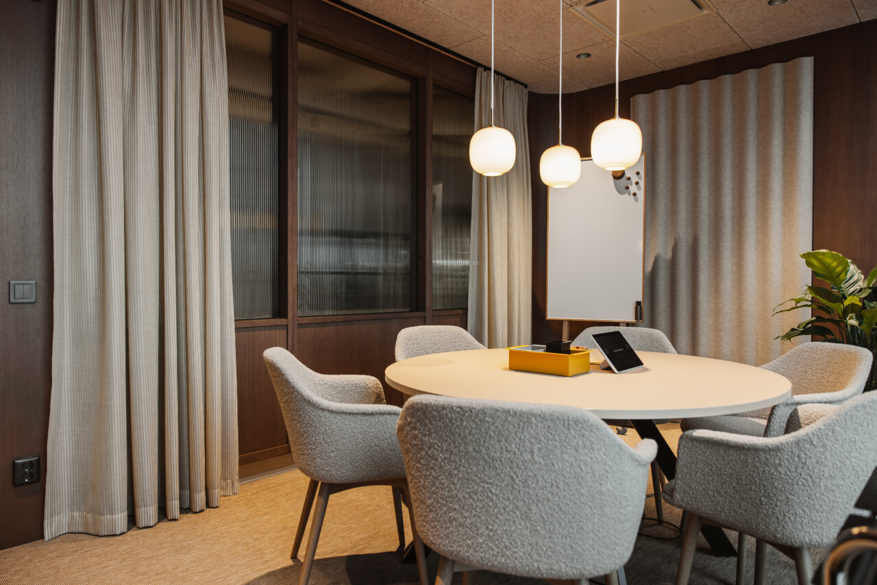 De enskilda mötesrummen ligger i entrérummets ytterkanter och är byggda som eleganta finsnickrade volymer i mörkoljad ek. Glaspartier i linjeglas ger avskildhet samtidigt som de släpper igenom ett mjukt dagsljus. Närheten till kaféet och de öppna ytorna gör det enkelt att växla mellan möten, gruppdiskussioner och pauser – något som bidrar till att entrérummet hålls levande och aktivt under hela dagen.